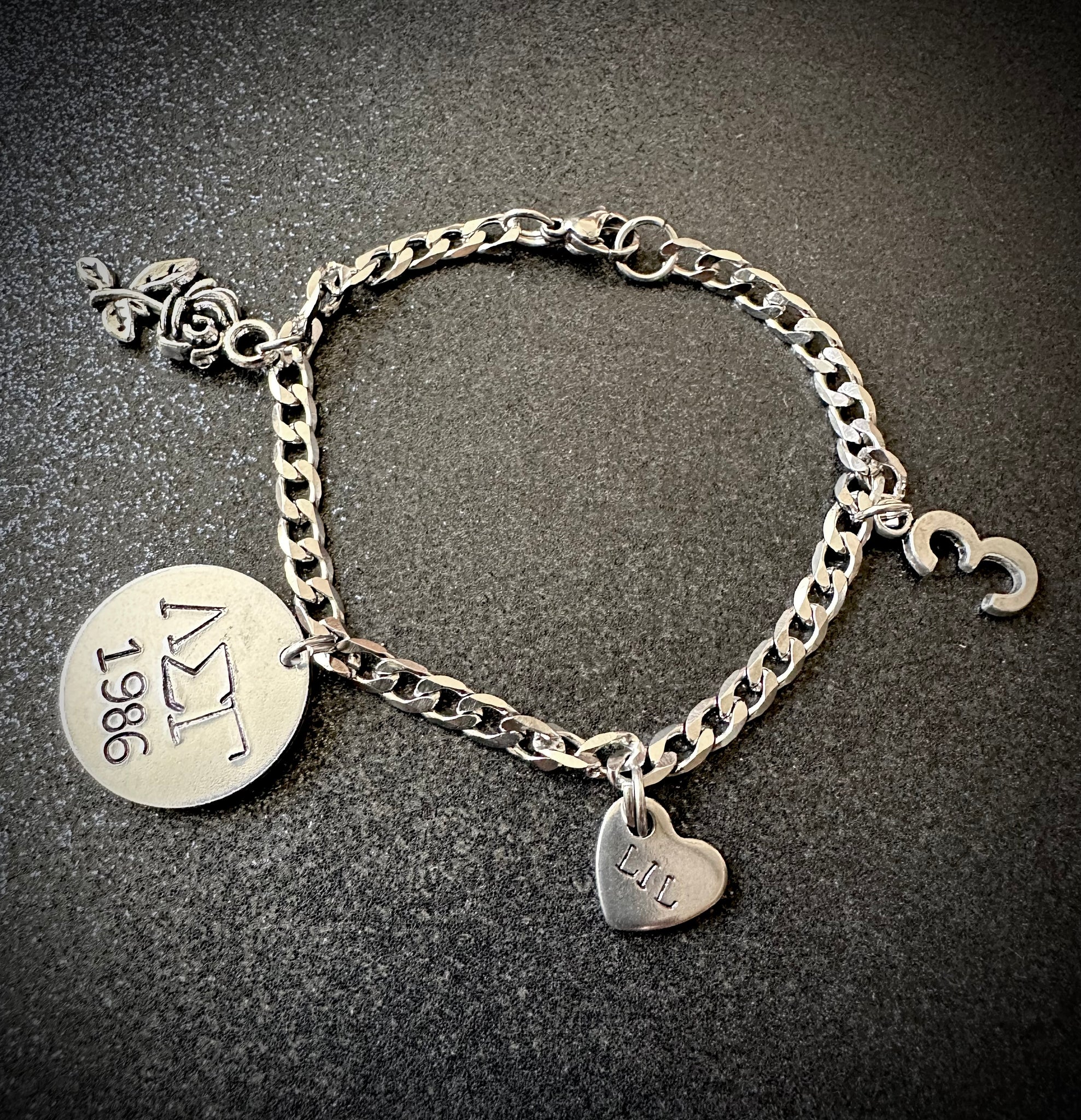 Stainless steel chain charm bracelet with your choice of 4 charms. Charms can be any charms from the charm menu (this includes the custom circle or heart charms that can have any similar writing as long as it fits. I will contact you if there's an issue with this.